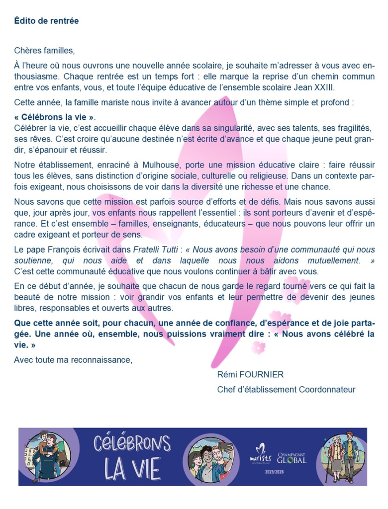 Vous trouverez ci-dessous le texte de M. Fournier pour cette rentrée scolaire placée sous le signe de la confiance, l’espérance et la joie partagée.